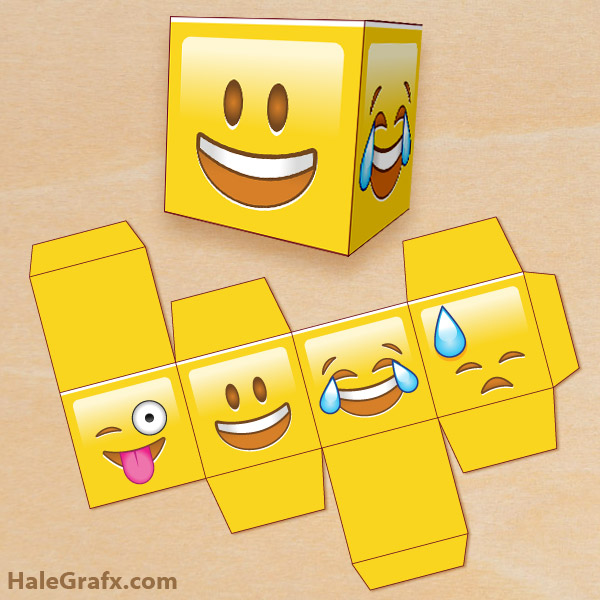 Get ready for Emoji party time. Here is a FREE printable Emoji treat box for your upcoming party. This treat box looks like an Emoji smashed into a box shape. There are four different Emoji expressions decorating this fun little treat holding box. Just rotate the boxes around after you have assembled to display in a variety of ways.