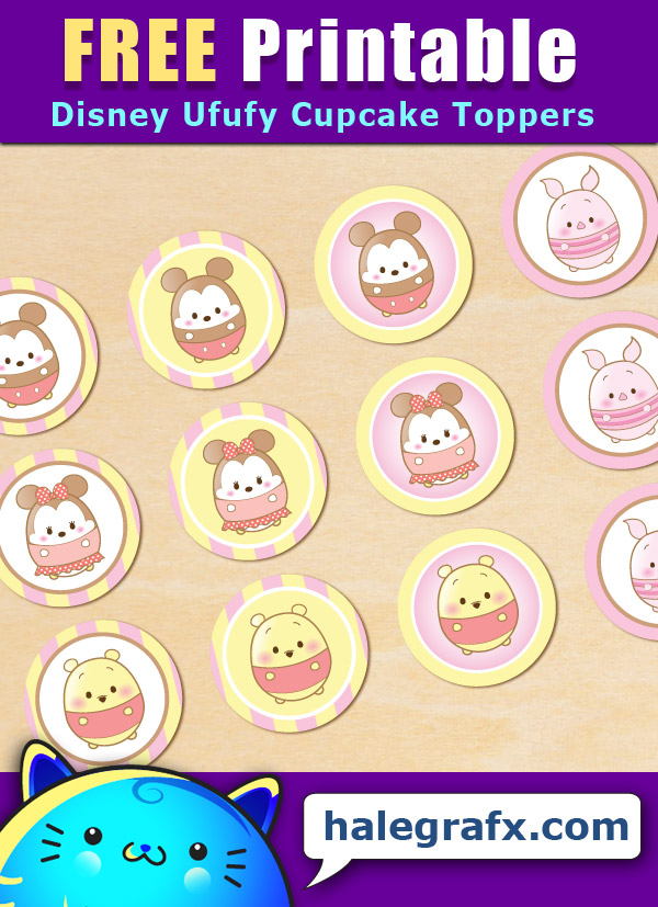 There are 10 different free Ufufy cupcake toppers to choose from. These include Mickey, Minnie, Winnie the Pooh and piglet. These are mixed with different colors, stripes and backgrounds. These free cupcake toppers print 12 to a sheet in PDF format.