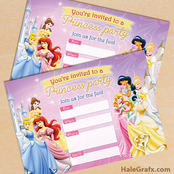 Your invitation download has a jpeg Disney Princesses invite which is easy to print; give it a try. This Great if you want to hand-write your details in the boxes. A great way to print and personalize for your royal guests. Write in a different messages for each guest. This Disney Princesses themed invitation measures 5 x 7 inches.