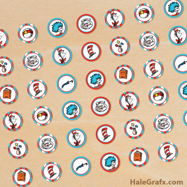 Make your treats fun and decorative this Dr. Seuss day. Here are free printable Dr. Seuss Hershey’s Kisses stickers to add to your Cat in the Hat theme. These fit great on the bottom of Hershey’s kisses or mini Reese’s Peanut Butter cups. Put them them in the favor bags for your kids, decorate with them, put them in prize bags for party activities or put them in a serving bowl :)