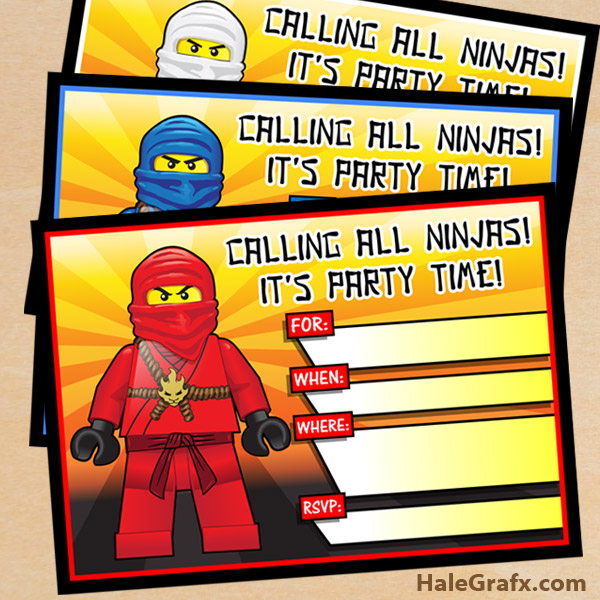 Using the free JPEG LEGO Ninjago invitations you can either quickly print and fill in your details with a pen or marker. If you have graphic editing software such a gimp or Photoshop, another option is edit the jpeg and add in your party info and then send it to print. These LEGO Ninjago themed invitations measures 5 x 7 inches.  Each JPEG invitation has a different color scheme and ninja.