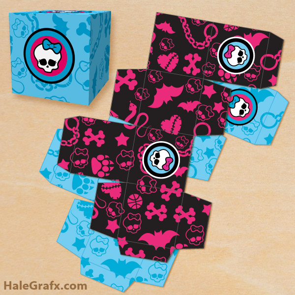 More fun printables for your Monster High parties! This is a FREE set of printable Monster High treat boxes that work great for holding candy, little Monster High jewelry or other party favors. There are two treat boxes included in this free download. These treat boxes are decorated with monster high skulls, bats, bones, snakes and other fun symbols.