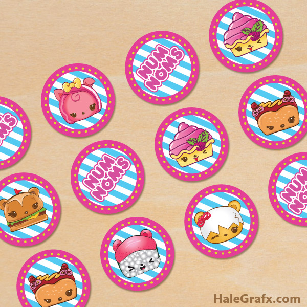 Do you already have cupcake toppers? Well then print these on sticker paper and make large Num Noms stickers to go on party favor bags, gifts and other creative uses you can come up with. These FREE Num Noms cupcake toppers print 12 to a sheet in PDF format. These free cupcake toppers are designed to be cut with scissors or a 2 inch craft punch and printable on 8.5 x 11 standard letter size paper.