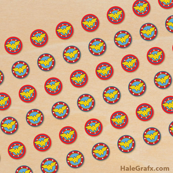 Got candy? These are free printable Wonder Woman Hershey’s Kisses stickers to decorate sweets and snacks for your upcoming superhero party! Pick some small candies and stick them on. Hershey’s kisses and mini Reese’s Peanut Butter cups work great. There is a variety of candies you could put these on. Even small lollipops work great. They also work great as table scatter or confetti! After you stick them to candies, put them in favor bags, a serving bowl or even a Wonder Woman themed pinata.