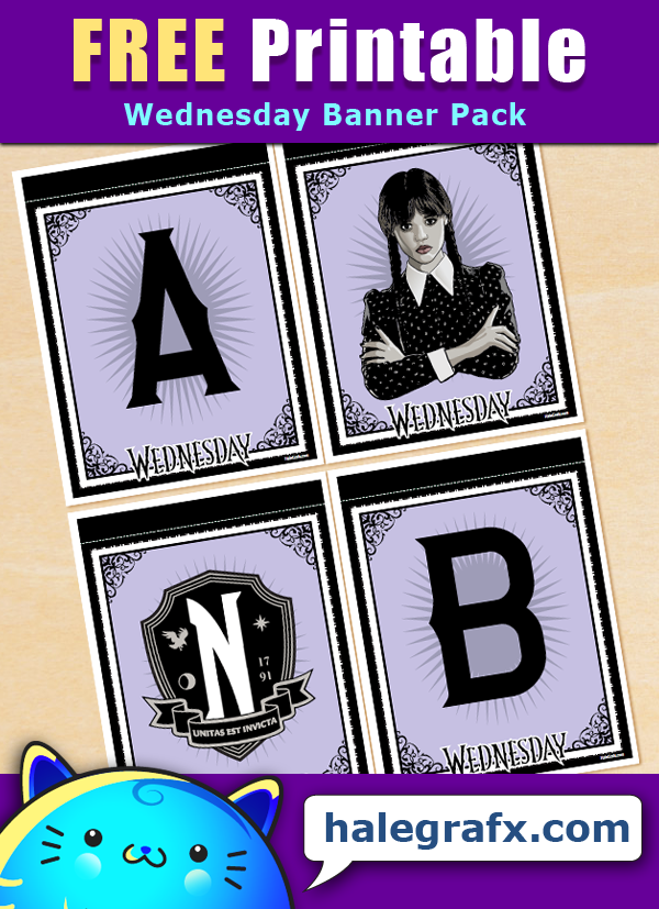 The spacer sheets have three different designs including Wednesday herself, Thing and the logo from Nevermore Academy. Print as many as you need to separate your words. Each banner page has Wednesday Addams’s logo at the bottom. The banner letters print on 8.5 x 11 single page PDFs. Each spacer sheet prints from its own PDF file so along with the letters you can print which ones you want.