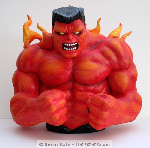 After the Hulk was cooled off from being in the oven I used acrylics to paint him and do touch ups to flame work as well as the hair, eyes and teeth and highlight the muscles. Finally I sprayed the new and improved Red Hulk statue with a protective clearcoat.