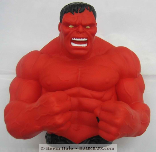 One afternoon I decided to take my kids to Toys “R” Us and while in the figure section looking at Marvel comics toys I found this Red Hulk bank. It seemed fairly sturdy as far as Hulk toys go however the mold was kind of cheesy looking and the paint job was really bad; also they used the same mold for the green incredible Hulk and the hair looked nothing like the Red Hulk‘s. Another minor issue was that my Incredible Hulk was missing its bottom so you couldn’t store money in the bank.