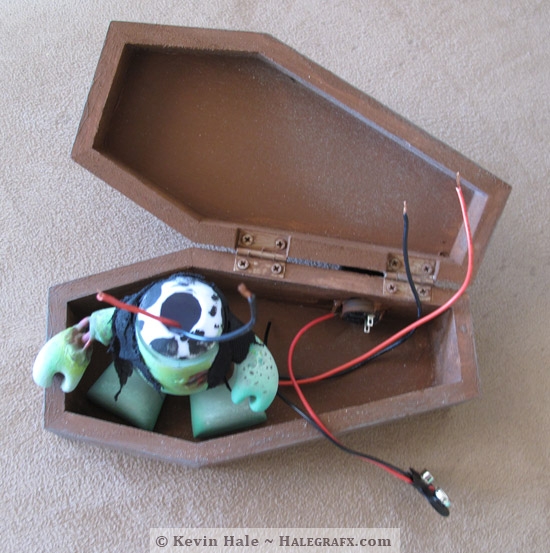 I added a rocker switch to the back of the coffin, added a connector for a 9V battery and some wires to go up to connect the LEDs inside the head. I then assembled the Color Blank Zombie figure back together. The battery was housed inside the coffin. If you are not much for wiring RoseArt has new illuminated Color Blanks figures that come with LEDs that make them glow!