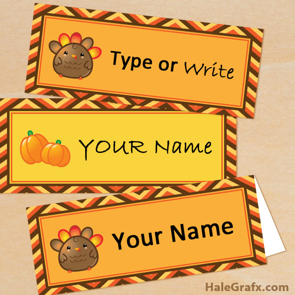 You can either write names or labels on these Turkey and pumpkin place cards or type right into the PDF file. Download your free printable Thanksgiving place cards below.