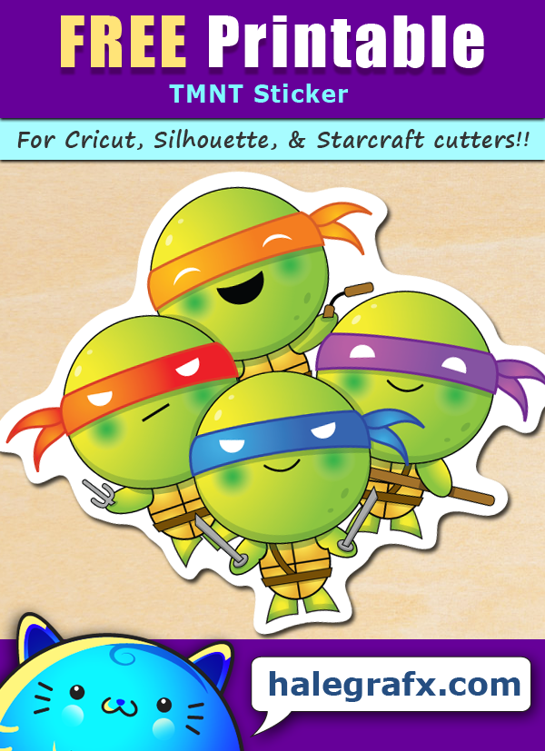 These free stickers have been optimized to print and cut on machines such as a Cricut Air, Silhouette Cameo, or Starcraft Solo on vinyl printer paper. You can also use them for scrapbooking, sticker collecting, party favors, on party favor bags or sticking to whatever suits you. You can certainly cut them by hand but these have been formatted so a cutting machine can read the lines and cut it for your you. Perfect for you, your friends or your kids who love the Ninja Turtles. These free TMNT stickers are optimized to print at approximately 2.75 x 2.25 inches, but can be resized.