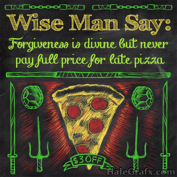 Here is some free printable Ninja Turtles themed Chalkboard art to hang up for a party or just for fun. I did this based on the 1990 Teenage Mutant Ninja Turtles Movie where Michelangelo orders a pizza and it shows up late. Michelangelo gives some words of wisdom to the pizza delivery guy while also reminding him of the 3 dollars off for the late pizza. It says “Wise Man Say: Forgiveness is divine but never pay full price for late pizza”. This includes illustrations of pizza, turtles shells and the Ninja Turtles’ weapons in Chalk board style art.