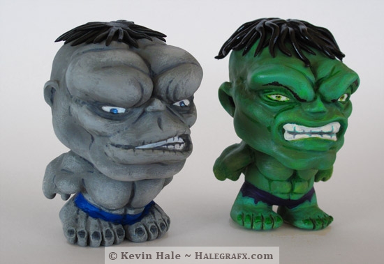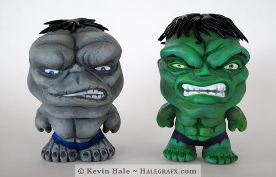 While the story of the green and gray hulks has evolved into different incarnations of the same entity, they are often depicted quite differently. I wanted capture some of these differences in my little hulk Color Blanks figures. Both of these hulk Color Blanks were customized using vinyl figures, polymer clay, acrylic paint and Color Blanks markers.