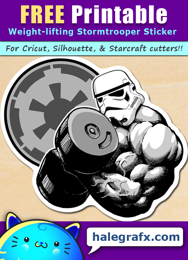 This free sticker has been optimized to print then cut on machines such as a Cricut Air, Silhouette Cameo, or Starcraft Solo on vinyl sticker paper. You can also use it for scrapbooking, sticker collecting, party favors, on party favor bags or sticking to whatever suits you. You can certainly cut it by hand but this sticker has been formatted so a cutting machine can read the lines and cut it for you. Perfect for you, your friends or your kids who love Stormtroopers and Star Wars, or working out! This free Stormtrooper sticker is optimized to print at approximately 2.75 x 2.25 inches, but can be resized.