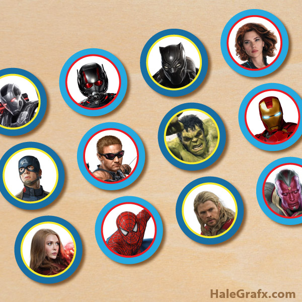 Assemble your Marvel super heroes for an Infinity War party. Get the party started with these free printable Avengers cupcake toppers. They work great for birthdays and game super hero themed parties! These cupcake toppers have 12 different Avengers designs, each with a Avengers super hero. These include: Incredible Hulk, Captain America, Thor, Iron man, Black Widow, Hawkeye, Vision, Scarlett Witch, Spider-man, Ant-man and Black Panther.
