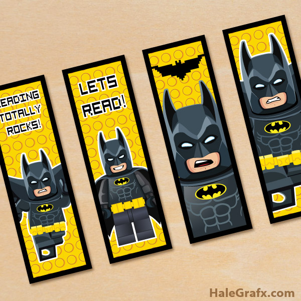 Read with the caped crusader! Here are Free printable LEGO Batman bookmarks. These work great to encourage kids to read and also giveaway as party favors at a LEGO or Batman themed party. This LEGO printable is in PDF format and prints 4 Batman bookmarks to a sheet. The bookmarks include different Batman minifigure poses and faces. Two of the bookmarks have text; one says “Reading Totally Rocks” and the other says “Let’s Read”.