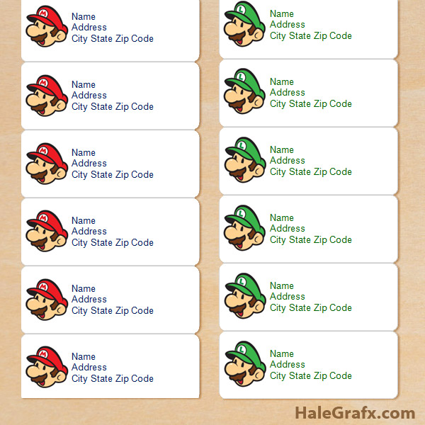 It’s the Super Mario Bros. on your address labels! These free Super Mario and Luigi address labels print 30 per sheet. This super Mario address label set come with one word document for printing Mario address labels and one for printing Luigi.
