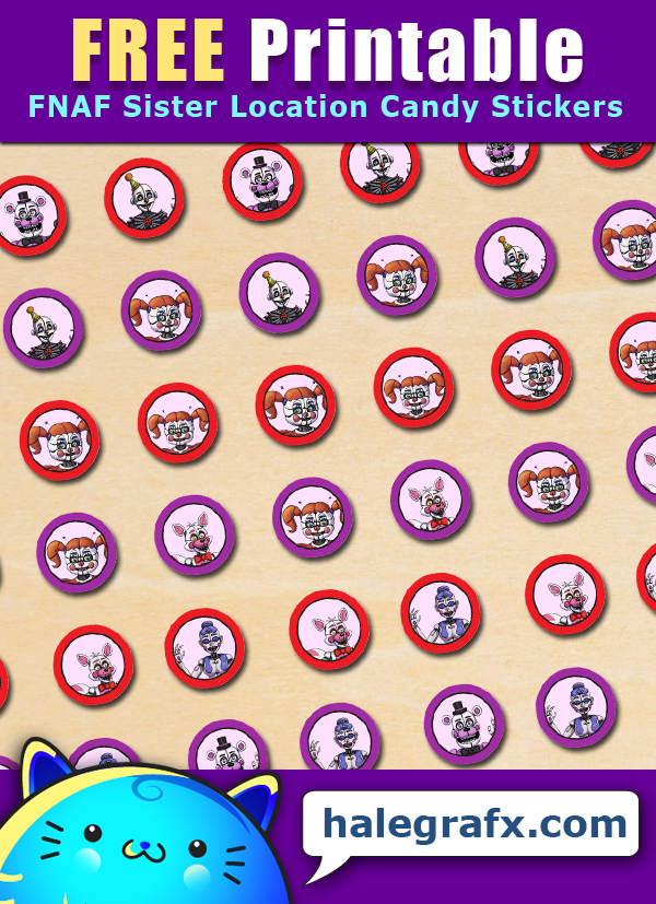 Here’s a fun way to add to your Five Nights at Freddy’s Sister Location themed party. These are FREE Printable Five Nights at Freddy’s Sister Location Hershey’s Kisses Stickers you can use in your party decorating. If you are having a piñata or candy dish at your party, put these free candy stickers on Hershey’s Kisses and other small candy. Lollipops, Rolos and small hard candy work great as well! Load them into your piñata for a fun surprise or have them out on display on your serving table for party guests.